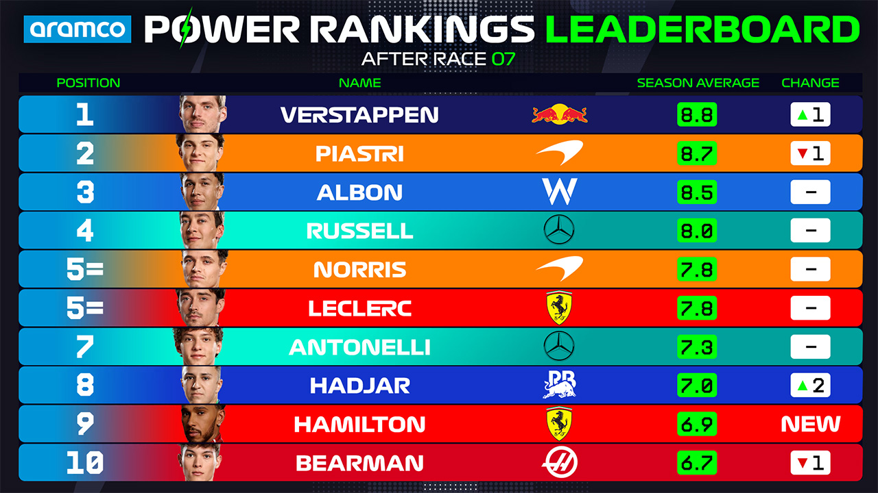 F1パワーランキングは、F1.comの5人の審査員がグランプリ終了後に各ドライバーを評価し、週末を通してのパフォーマンスに応じて10点満点で採点。専門家のスコアを平均してレーススコアを作成し、そのスコアは総合パワーランキングのリーダーボードでシーズンを通して集計される。